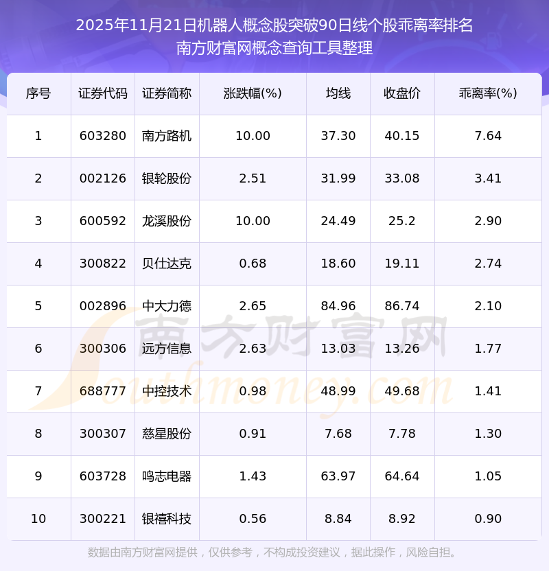 根據(jù)南方財富網(wǎng)概念查詢工具數(shù)據(jù)統(tǒng)計,截止2025年11月21日收盤,機器人概念股共有11只個股收盤價向上突破了90日線。其中乖離率較大的個股有南方路機、銀輪股份、龍溪股份等,乖離率分別為7.64%、3.41%、2.90%。