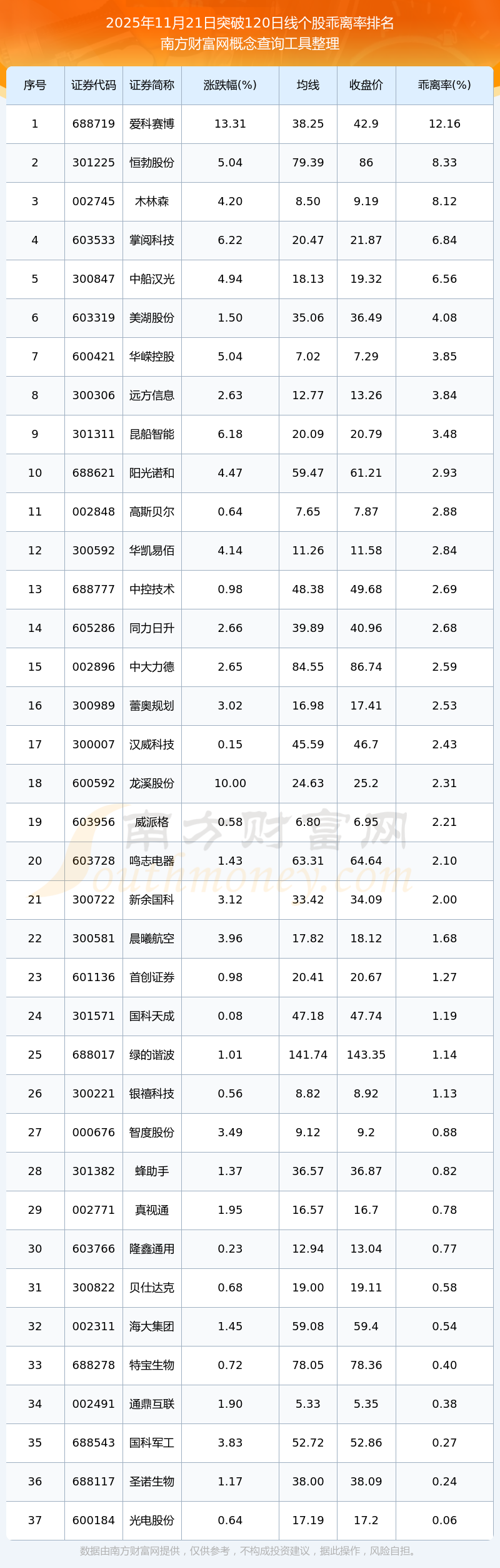 根據(jù)南方財(cái)富網(wǎng)概念查詢工具數(shù)據(jù)統(tǒng)計(jì),截止2025年11月21日收盤,共有37只個(gè)股收盤價(jià)向上突破了半年線,其中乖離率較大的個(gè)股有愛(ài)科賽博、恒勃股份、木林森、掌閱科技、中船漢光等,乖離率分別為12.16%、8.33%、8.12%、6.84%、6.56%。