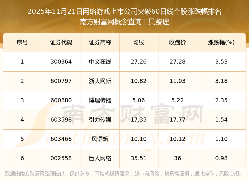 根據(jù)南方財(cái)富網(wǎng)概念查詢工具數(shù)據(jù)統(tǒng)計(jì),截止2025年11月21日收盤,網(wǎng)絡(luò)游戲上市公司共有6只個(gè)股收盤價(jià)向上突破了60日線。其中漲幅較大的個(gè)股有中文在線、浙大網(wǎng)新、博瑞傳播等,漲幅分別為3.53%、3.18%、2.35%。
