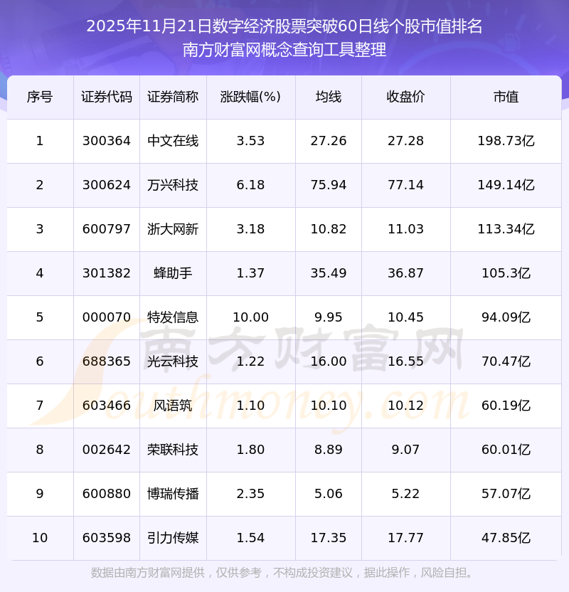 根據(jù)南方財富網(wǎng)概念查詢工具數(shù)據(jù)統(tǒng)計,截止2025年11月21日收盤,數(shù)字經(jīng)濟(jì)股票共有10只個股收盤價向上突破了60日線。其中市值較大的個股有中文在線、萬興科技、浙大網(wǎng)新等,市值分別為198.73億、149.14億、113.34億。