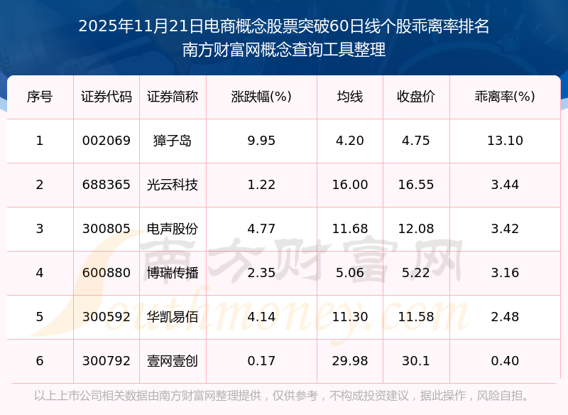 根據(jù)南方財(cái)富網(wǎng)概念查詢工具數(shù)據(jù)統(tǒng)計(jì),截止2025年11月21日收盤,電商概念股票共有6只個股收盤價(jià)向上突破了60日線。其中乖離率較大的個股有獐子島、光云科技、電聲股份等,乖離率分別為13.10%、3.44%、3.42%。