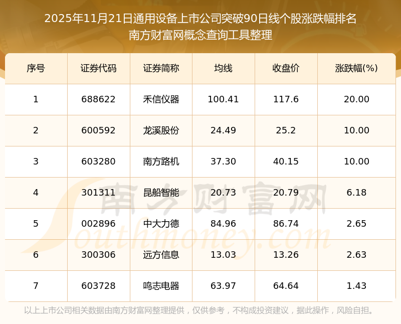 2025年11月21日通用設(shè)備上市公司突破90日線個(gè)股漲跌幅排名