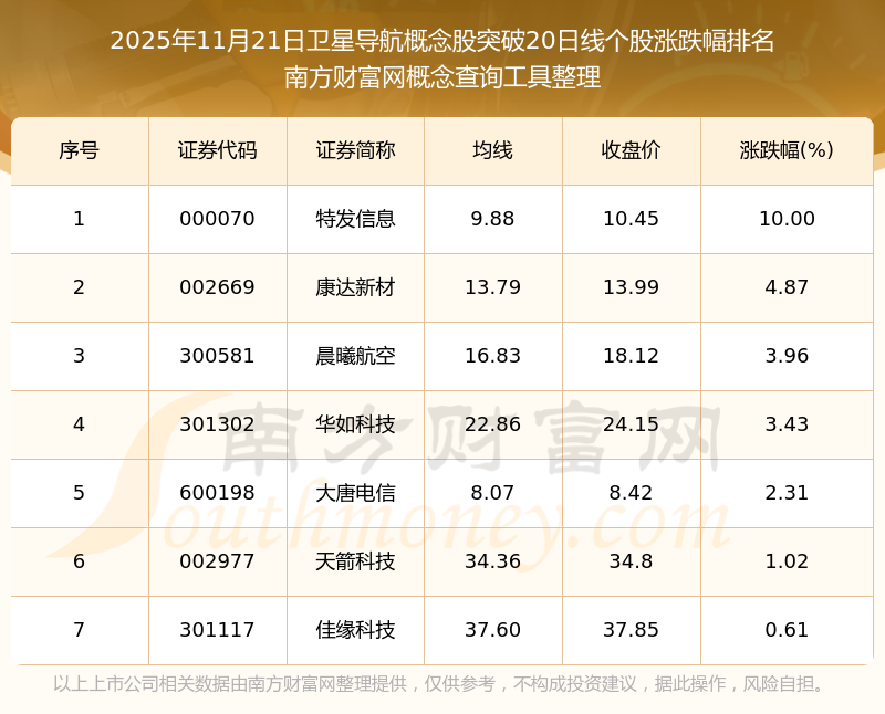 2025年11月21日衛(wèi)星導(dǎo)航概念股突破20日線個(gè)股漲跌幅排名