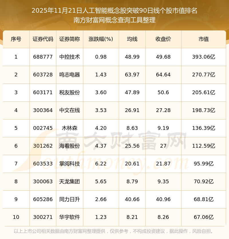 根據南方財富網概念查詢工具數(shù)據統(tǒng)計,截止2025年11月21日收盤,人工智能概念股共有21只個股收盤價向上突破了90日線。其中市值較大的個股有中控技術、鳴志電器、稅友股份等,市值分別為393.06億、270.77億、205.61億。