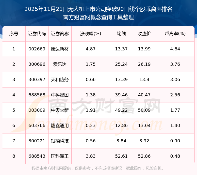 2025年11月21日無(wú)人機(jī)上市公司突破90日線個(gè)股乖離率排名