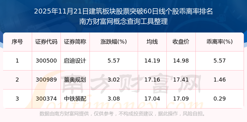 2025年11月21日建筑板塊股票突破60日線(xiàn)個(gè)股乖離率排名