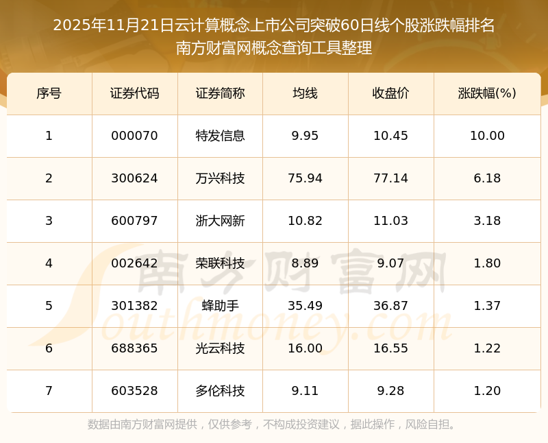 根據(jù)南方財富網(wǎng)概念查詢工具數(shù)據(jù)統(tǒng)計,截止2025年11月21日收盤,云計算概念上市公司共有7只個股收盤價向上突破了60日線。其中漲幅較大的個股有特發(fā)信息、萬興科技、浙大網(wǎng)新等,漲幅分別為10.00%、6.18%、3.18%。