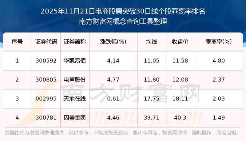 2025年11月21日電商股票突破30日線個(gè)股乖離率排名