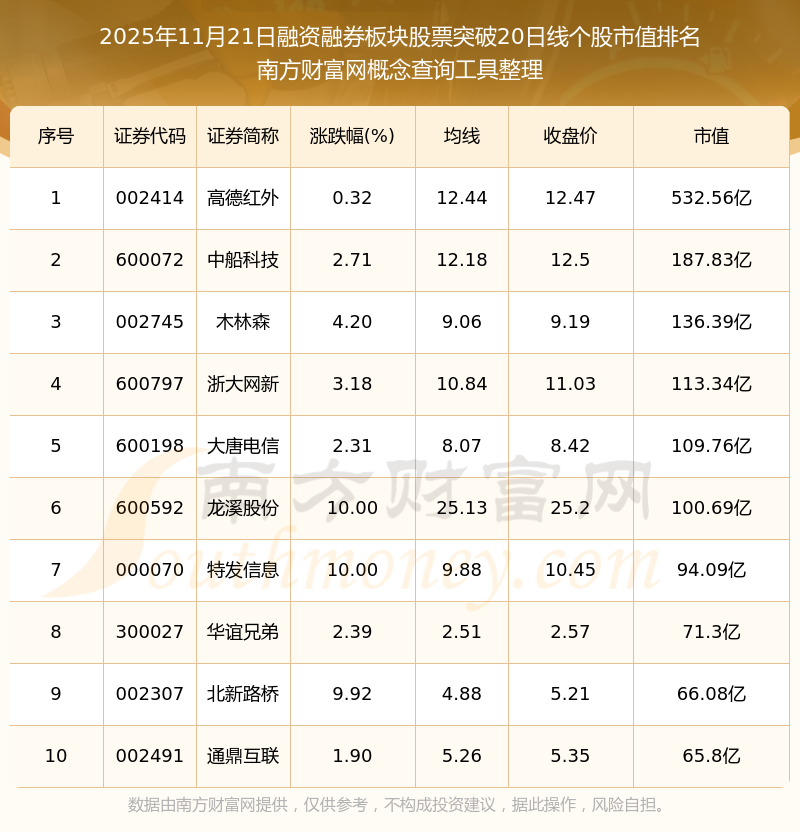 2025年11月21日融資融券板塊股票突破20日線個股市值排名