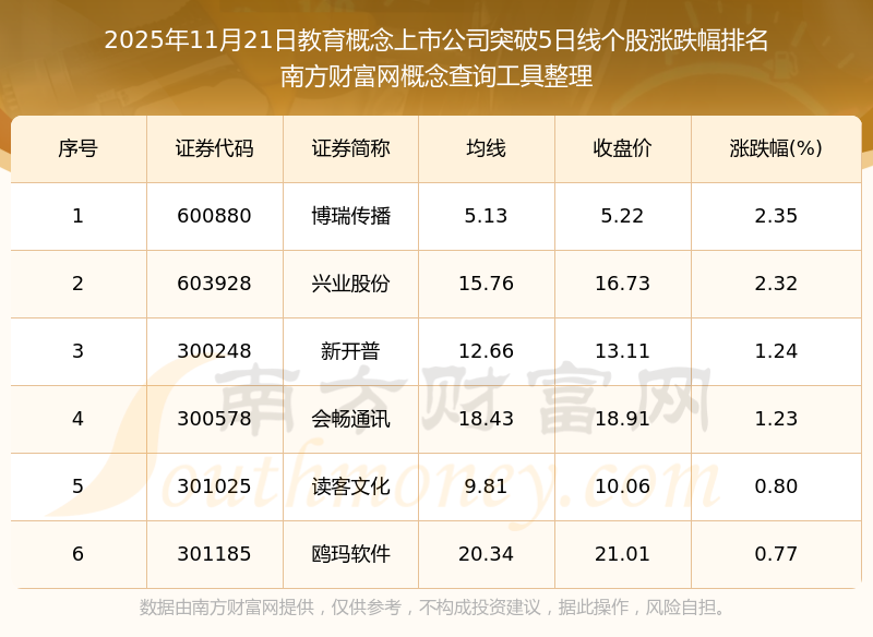 根據(jù)南方財(cái)富網(wǎng)概念查詢工具數(shù)據(jù)統(tǒng)計(jì),截止2025年11月21日收盤,教育概念上市公司共有6只個(gè)股收盤價(jià)向上突破了5日線。其中漲幅較大的個(gè)股有博瑞傳播、興業(yè)股份、新開普等,漲幅分別為2.35%、2.32%、1.24%。
