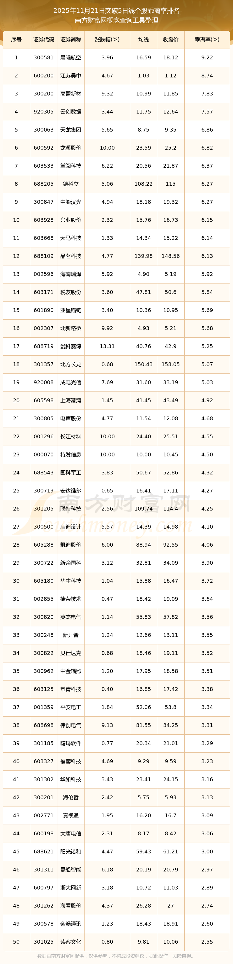 根據(jù)南方財富網(wǎng)概念查詢工具數(shù)據(jù)統(tǒng)計,截止2025年11月21日收盤,共有96只個股收盤價向上突破了5日線,其中乖離率較大的個股有晨曦航空、江蘇吳中、高盟新材、云創(chuàng)數(shù)據(jù)、天龍集團等,乖離率分別為9.22%、8.74%、7.83%、7.57%、6.86%。