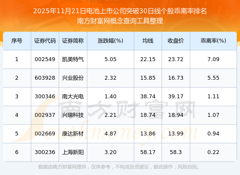 根據(jù)南方財富網(wǎng)概念查詢工具數(shù)據(jù)統(tǒng)計,截止2025年11月21日收盤,電池上市公司共有6只個股收盤價向上突破了30日線。其中乖離率較大的個股有凱美特氣、興業(yè)股份、南大光電等,乖離率分別為7.09%、5.55%、1.11%。