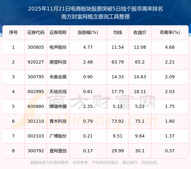 2025年11月21日電商板塊股票突破5日線個(gè)股乖離率排名
