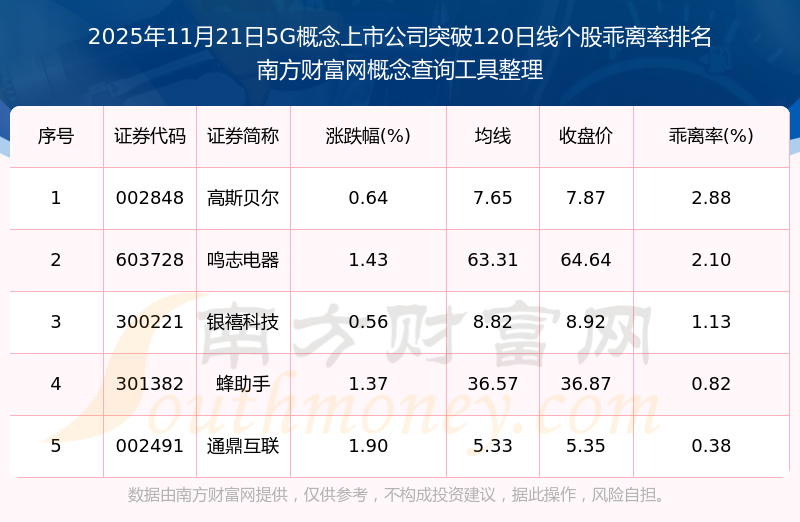 根據(jù)南方財富網(wǎng)概念查詢工具數(shù)據(jù)統(tǒng)計,截止2025年11月21日收盤,5G概念上市公司共有5只個股收盤價向上突破了120日線。其中乖離率較大的個股有高斯貝爾、鳴志電器、銀禧科技等,乖離率分別為2.88%、2.10%、1.13%。