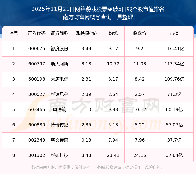 根據(jù)南方財富網(wǎng)概念查詢工具數(shù)據(jù)統(tǒng)計,截止2025年11月21日收盤,網(wǎng)絡游戲股票共有8只個股收盤價向上突破了5日線。其中市值較大的個股有智度股份、浙大網(wǎng)新、大唐電信等,市值分別為116.41億、113.34億、109.76億。