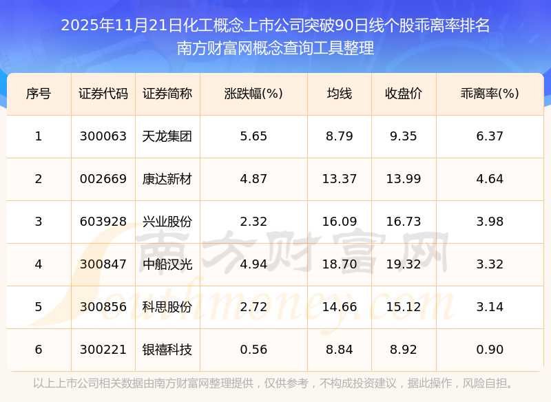 根據(jù)南方財富網(wǎng)概念查詢工具數(shù)據(jù)統(tǒng)計,截止2025年11月21日收盤,化工概念上市公司共有6只個股收盤價向上突破了90日線。其中乖離率較大的個股有天龍集團(tuán)、康達(dá)新材、興業(yè)股份等,乖離率分別為6.37%、4.64%、3.98%。