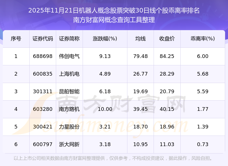 2025年11月21日機(jī)器人概念股票突破30日線個(gè)股乖離率排名