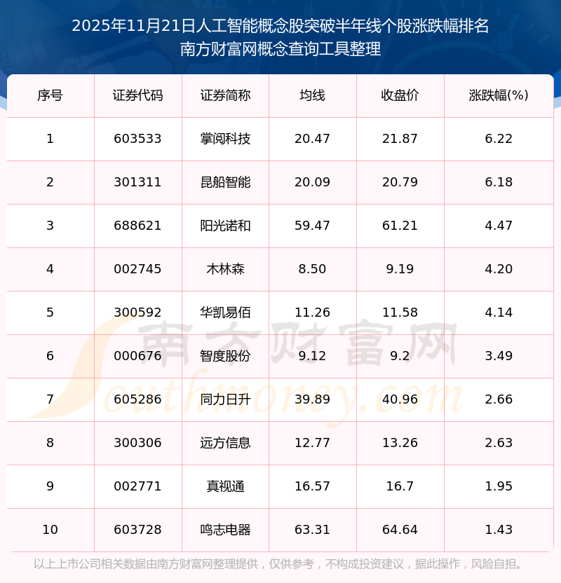 2025年11月21日人工智能概念股突破半年線個股漲跌幅排名