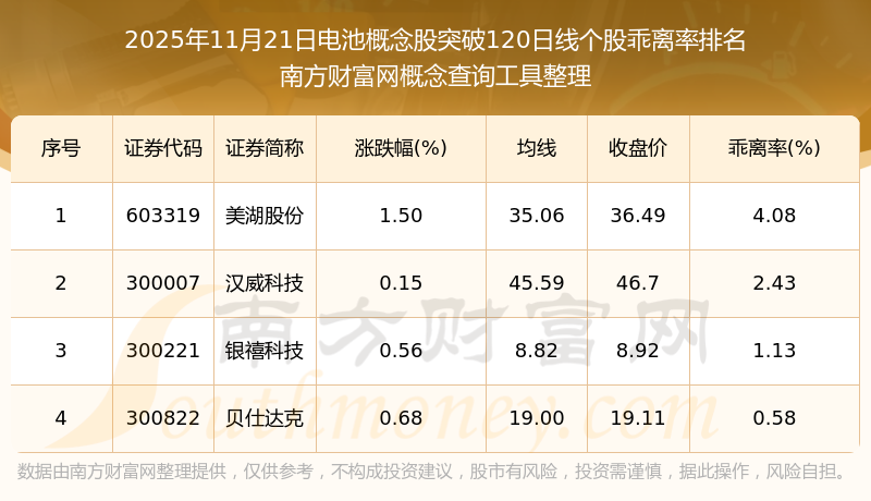 根據(jù)南方財富網(wǎng)概念查詢工具數(shù)據(jù)統(tǒng)計,截止2025年11月21日收盤,電池概念股共有4只個股收盤價向上突破了120日線。其中乖離率較大的個股有美湖股份、漢威科技、銀禧科技等,乖離率分別為4.08%、2.43%、1.13%。