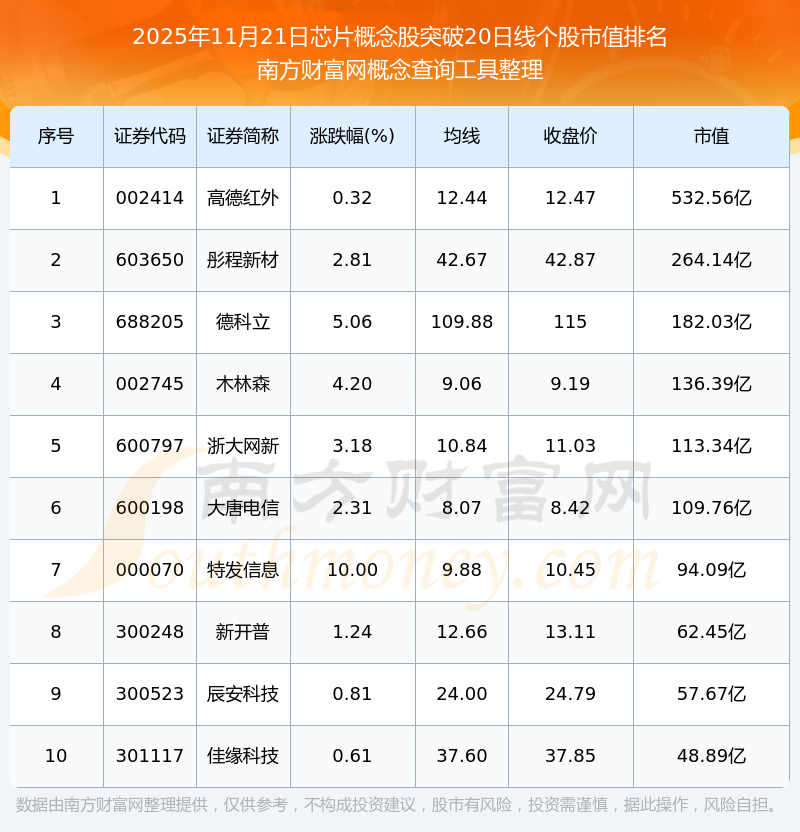 2025年11月21日芯片概念股突破20日線個(gè)股市值排名