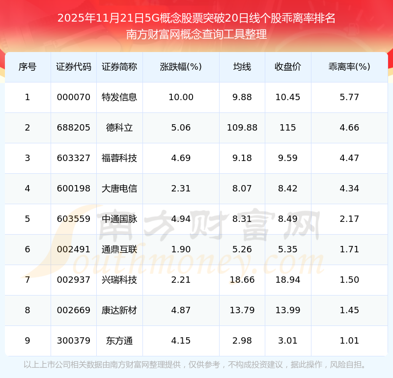 根據(jù)南方財富網(wǎng)概念查詢工具數(shù)據(jù)統(tǒng)計,截止2025年11月21日收盤,5G概念股票共有9只個股收盤價向上突破了20日線。其中乖離率較大的個股有特發(fā)信息、德科立、福蓉科技等,乖離率分別為5.77%、4.66%、4.47%。