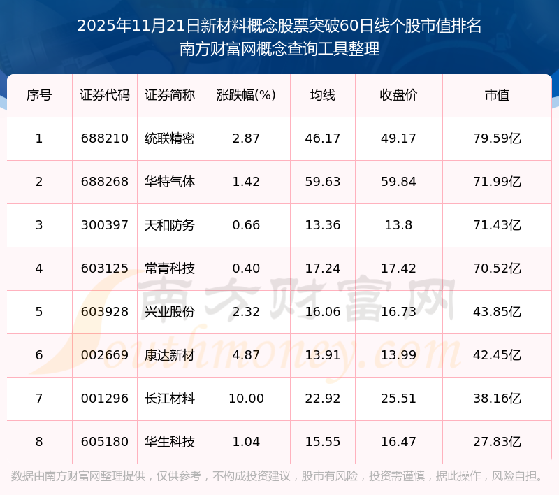根據(jù)南方財富網(wǎng)概念查詢工具數(shù)據(jù)統(tǒng)計,截止2025年11月21日收盤,新材料概念股票共有8只個股收盤價向上突破了60日線。其中市值較大的個股有統(tǒng)聯(lián)精密、華特氣體、天和防務等,市值分別為79.36億、71.99億、71.43億。