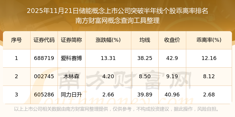 根據(jù)南方財(cái)富網(wǎng)概念查詢工具數(shù)據(jù)統(tǒng)計(jì),截止2025年11月21日收盤,儲能概念上市公司共有3只個(gè)股收盤價(jià)向上突破了半年線。其中乖離率較大的個(gè)股有愛科賽博、木林森、同力日升等,乖離率分別為12.16%、8.12%、2.68%。
