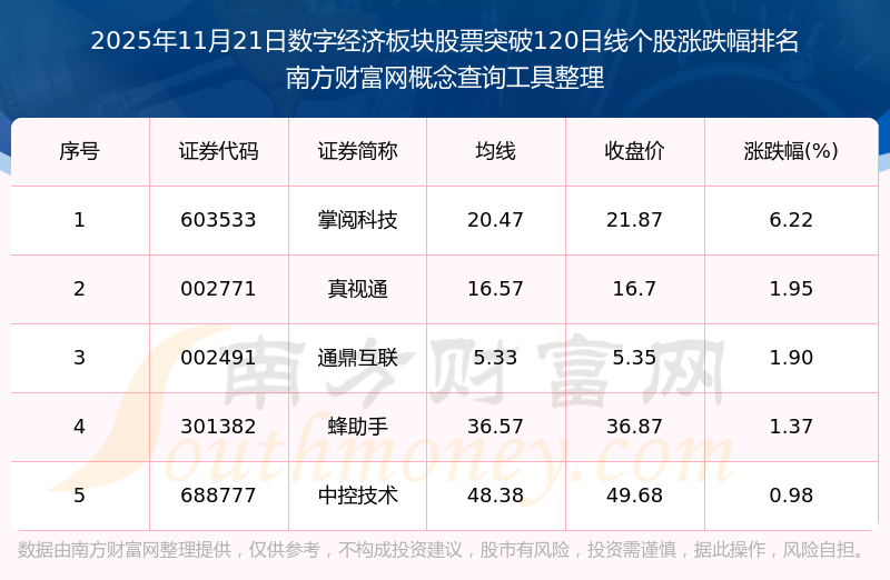 2025年11月21日數(shù)字經(jīng)濟板塊股票突破120日線個股漲跌幅排名
