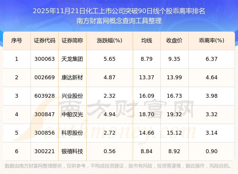2025年11月21日化工上市公司突破90日線個(gè)股乖離率排名