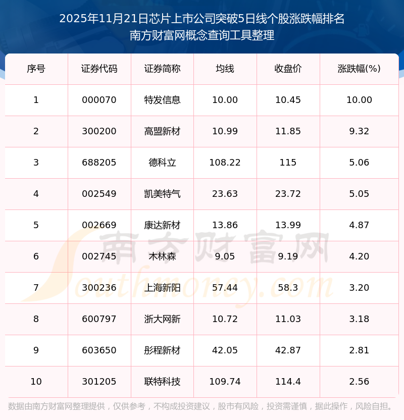 根據(jù)南方財富網(wǎng)概念查詢工具數(shù)據(jù)統(tǒng)計,截止2025年11月21日收盤,芯片上市公司共有19只個股收盤價向上突破了5日線。其中漲幅較大的個股有特發(fā)信息、高盟新材、德科立等,漲幅分別為10.00%、9.32%、5.06%。