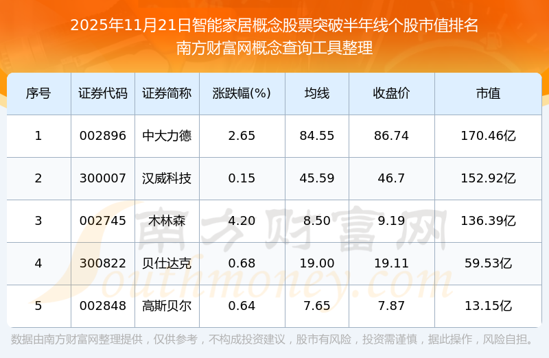 根據(jù)南方財(cái)富網(wǎng)概念查詢工具數(shù)據(jù)統(tǒng)計(jì),截止2025年11月21日收盤,智能家居概念股票共有5只個(gè)股收盤價(jià)向上突破了半年線。其中市值較大的個(gè)股有中大力德、漢威科技、木林森等,市值分別為170.46億、152.92億、136.39億。