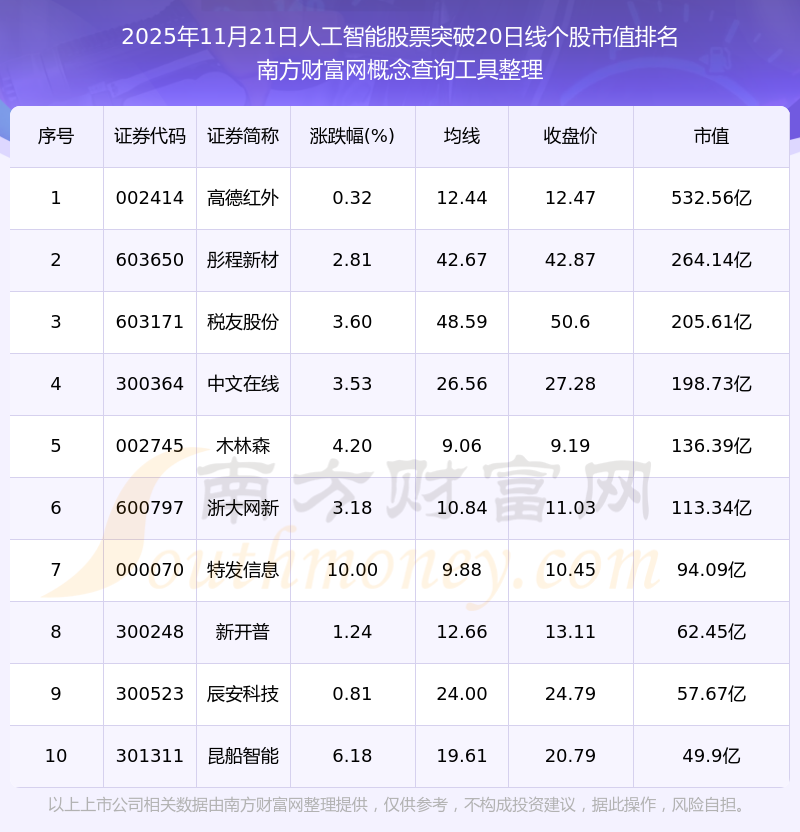 2025年11月21日人工智能股票突破20日線個(gè)股市值排名