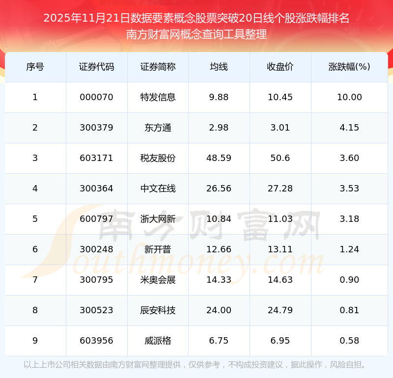 根據(jù)南方財富網(wǎng)概念查詢工具數(shù)據(jù)統(tǒng)計,截止2025年11月21日收盤,數(shù)據(jù)要素概念股票共有9只個股收盤價向上突破了20日線。其中漲幅較大的個股有特發(fā)信息、東方通、稅友股份等,漲幅分別為10.00%、4.15%、3.60%。