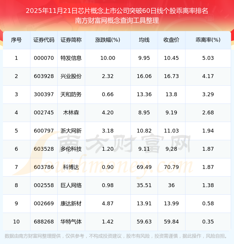 根據南方財富網概念查詢工具數據統(tǒng)計,截止2025年11月21日收盤,芯片概念上市公司共有10只個股收盤價向上突破了60日線。其中乖離率較大的個股有特發(fā)信息、興業(yè)股份、天和防務等,乖離率分別為5.03%、4.17%、3.29%。