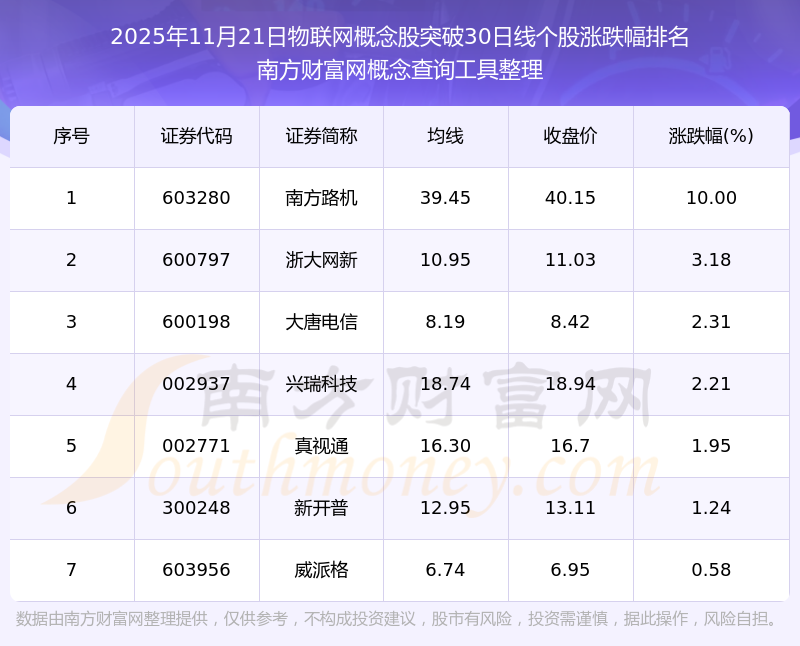 2025年11月21日物聯(lián)網(wǎng)概念股突破30日線個(gè)股漲跌幅排名