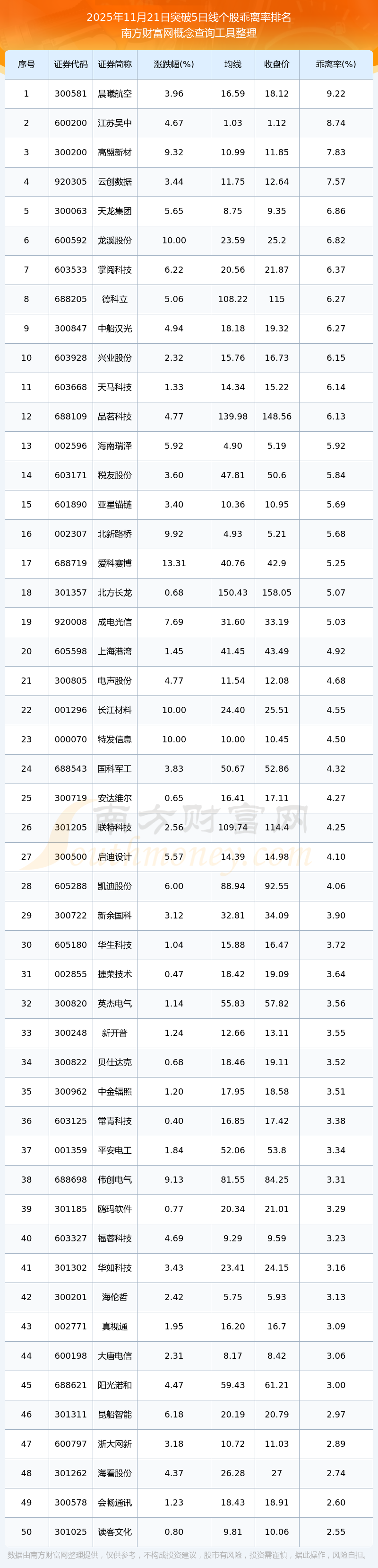 根據(jù)南方財富網(wǎng)概念查詢工具數(shù)據(jù)統(tǒng)計,截止2025年11月21日收盤,共有96只個股收盤價向上突破了5日線,其中乖離率較大的個股有晨曦航空、江蘇吳中、高盟新材、云創(chuàng)數(shù)據(jù)、天龍集團等,乖離率分別為9.22%、8.74%、7.83%、7.57%、6.86%。