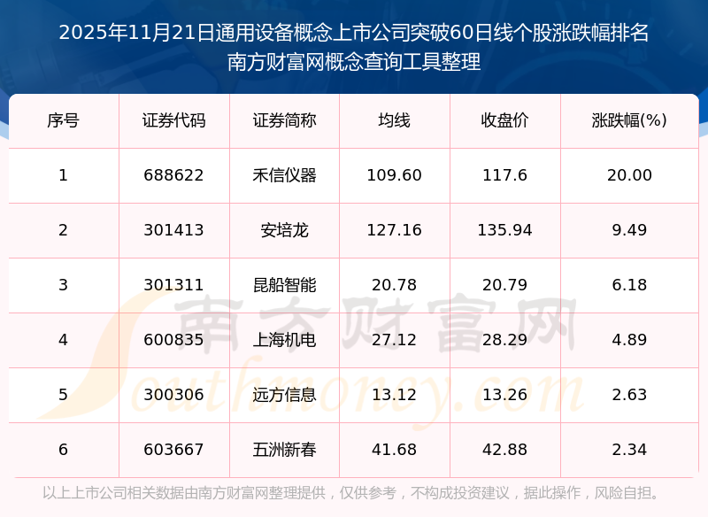 根據(jù)南方財(cái)富網(wǎng)概念查詢工具數(shù)據(jù)統(tǒng)計(jì),截止2025年11月21日收盤,通用設(shè)備概念上市公司共有6只個(gè)股收盤價(jià)向上突破了60日線。其中漲幅較大的個(gè)股有禾信儀器、安培龍、昆船智能等,漲幅分別為20.00%、9.49%、6.18%。