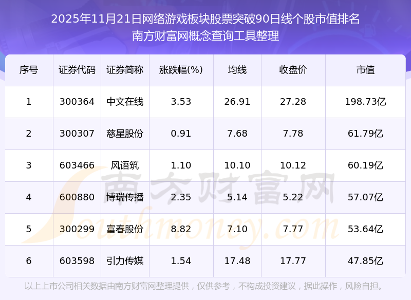 2025年11月21日網絡游戲板塊股票突破90日線個股市值排名