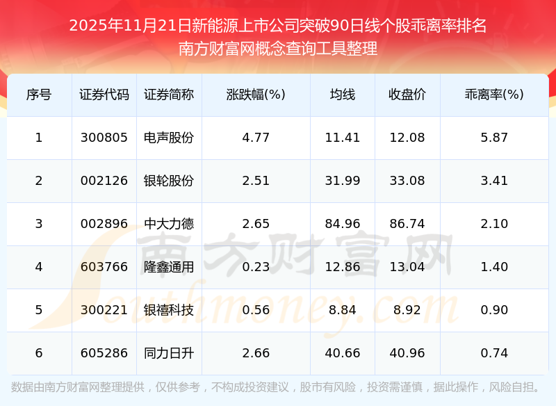 根據(jù)南方財(cái)富網(wǎng)概念查詢(xún)工具數(shù)據(jù)統(tǒng)計(jì),截止2025年11月21日收盤(pán),新能源上市公司共有6只個(gè)股收盤(pán)價(jià)向上突破了90日線(xiàn)。其中乖離率較大的個(gè)股有電聲股份、銀輪股份、中大力德等,乖離率分別為5.87%、3.41%、2.10%。