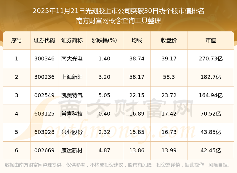 2025年11月21日光刻膠上市公司突破30日線個股市值排名