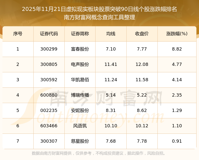 根據(jù)南方財富網(wǎng)概念查詢工具數(shù)據(jù)統(tǒng)計,截止2025年11月21日收盤,虛擬現(xiàn)實板塊股票共有7只個股收盤價向上突破了90日線。其中漲幅較大的個股有富春股份、電聲股份、華凱易佰等,漲幅分別為8.82%、4.77%、4.14%。