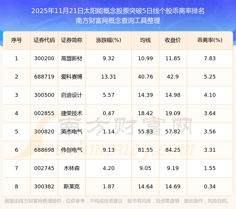 2025年11月21日太陽能概念股票突破5日線個(gè)股乖離率排名