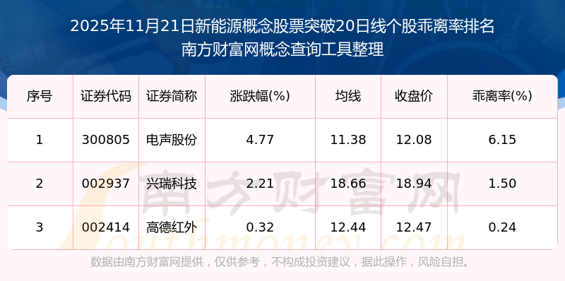 根據(jù)南方財(cái)富網(wǎng)概念查詢工具數(shù)據(jù)統(tǒng)計(jì),截止2025年11月21日收盤,新能源概念股票共有3只個(gè)股收盤價(jià)向上突破了20日線。其中乖離率較大的個(gè)股有電聲股份、興瑞科技、高德紅外等,乖離率分別為6.15%、1.50%、0.24%。