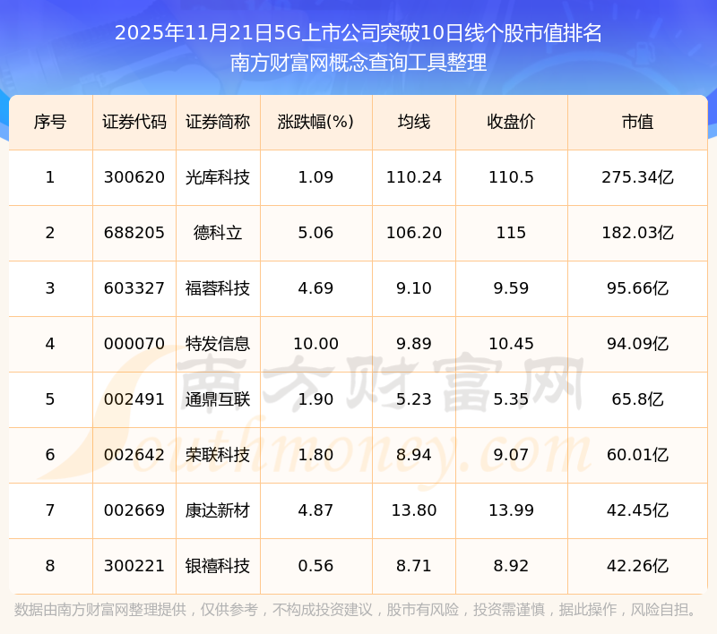 2025年11月21日5G上市公司突破10日線個(gè)股市值排名