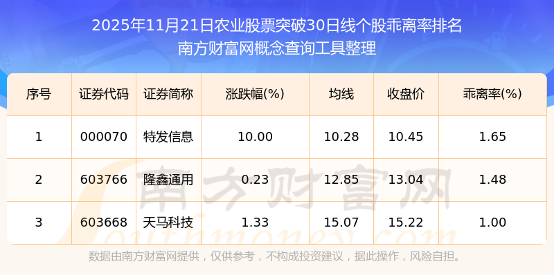 根據(jù)南方財富網(wǎng)概念查詢工具數(shù)據(jù)統(tǒng)計,截止2025年11月21日收盤,農業(yè)股票共有3只個股收盤價向上突破了30日線。其中乖離率較大的個股有特發(fā)信息、隆鑫通用、天馬科技等,乖離率分別為1.65%、1.48%、1.00%。