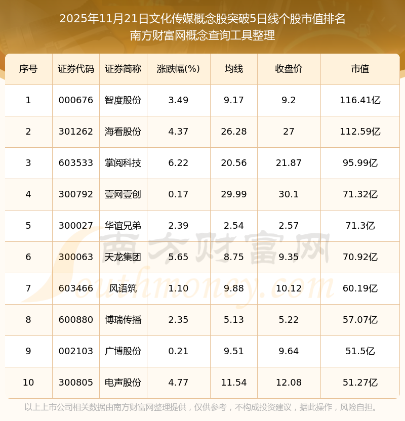 2025年11月21日文化傳媒概念股突破5日線個(gè)股市值排名