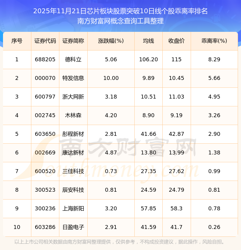 根據(jù)南方財(cái)富網(wǎng)概念查詢工具數(shù)據(jù)統(tǒng)計(jì),截止2025年11月21日收盤,芯片板塊股票共有12只個(gè)股收盤價(jià)向上突破了10日線。其中乖離率較大的個(gè)股有德科立、特發(fā)信息、浙大網(wǎng)新等,乖離率分別為8.29%、5.66%、4.95%。