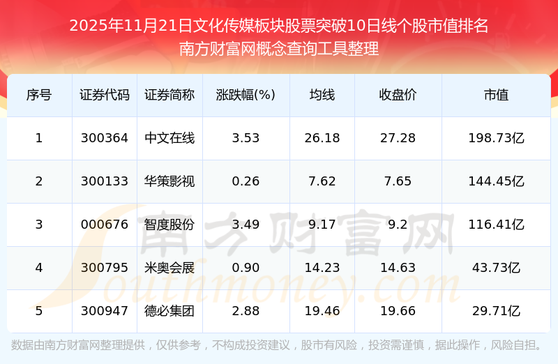 2025年11月21日文化傳媒板塊股票突破10日線個股市值排名