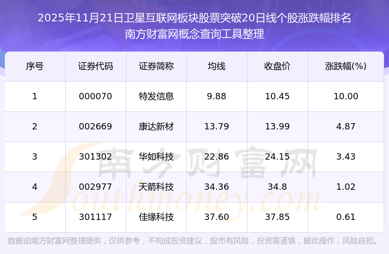 2025年11月21日衛(wèi)星互聯(lián)網(wǎng)板塊股票突破20日線個股漲跌幅排名