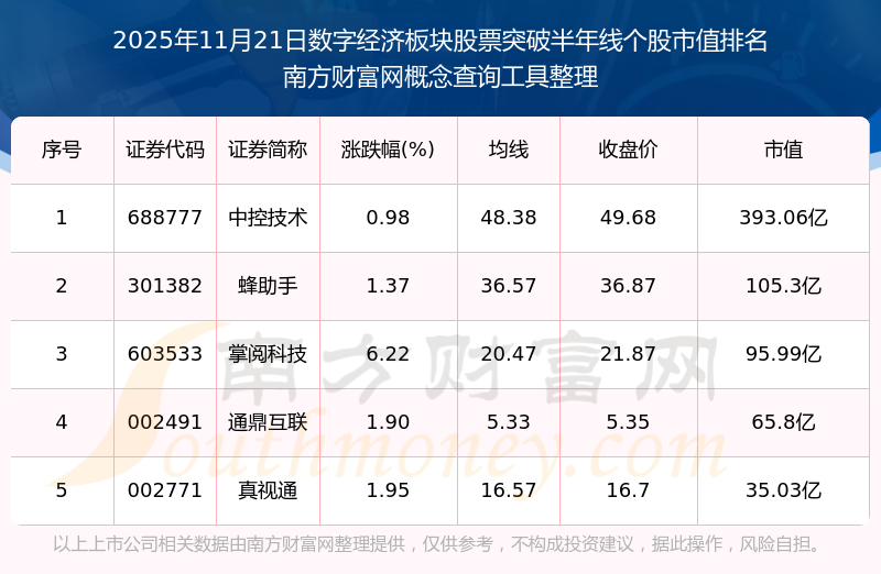 根據(jù)南方財富網(wǎng)概念查詢工具數(shù)據(jù)統(tǒng)計,截止2025年11月21日收盤,數(shù)字經(jīng)濟板塊股票共有5只個股收盤價向上突破了半年線。其中市值較大的個股有中控技術、蜂助手、掌閱科技等,市值分別為393.06億、105.3億、95.99億。